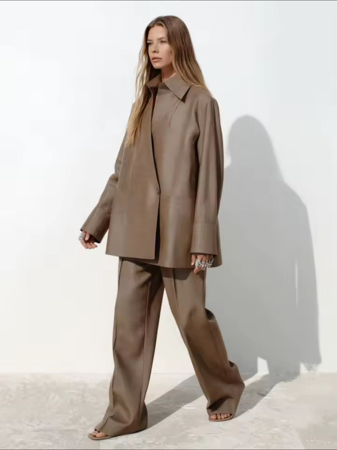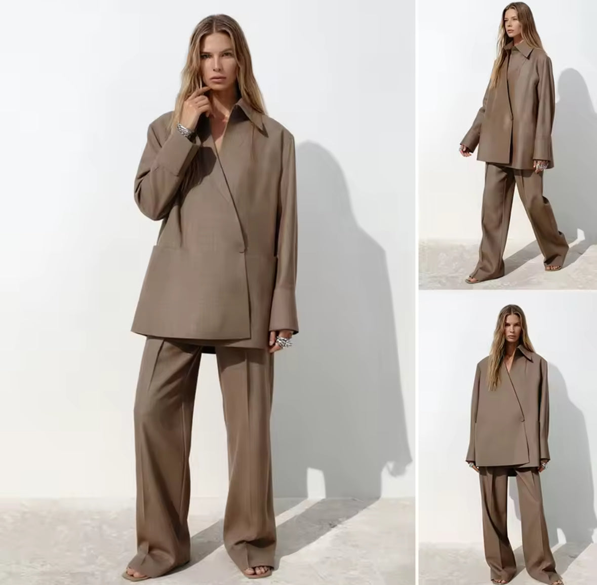 Das Beige Icon Set steht für schlichte Eleganz und modernen Minimalismus. Der oversized Blazer mit verdeckter Knopfleiste und markantem Kragen kombiniert sich mit einer weit geschnittenen, fließenden Hose in edlem Beige. Ein zeitloses Ensemble, das Selbstbewusstsein und Stil ausstrahlt – perfekt für Business, Events oder als Fashion-Statement im Alltag.
