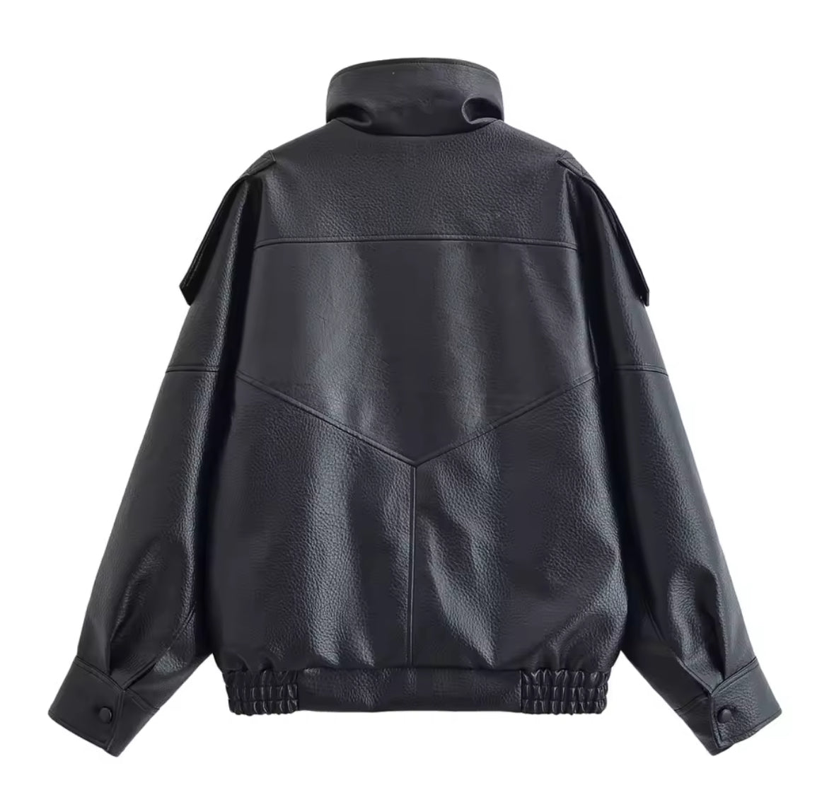 Ihr markanter Oversized-Schnitt, das strukturierte vegane Leder und der hohe Stehkragen machen sie zu einem echten Statement-Piece für die neue Saison.