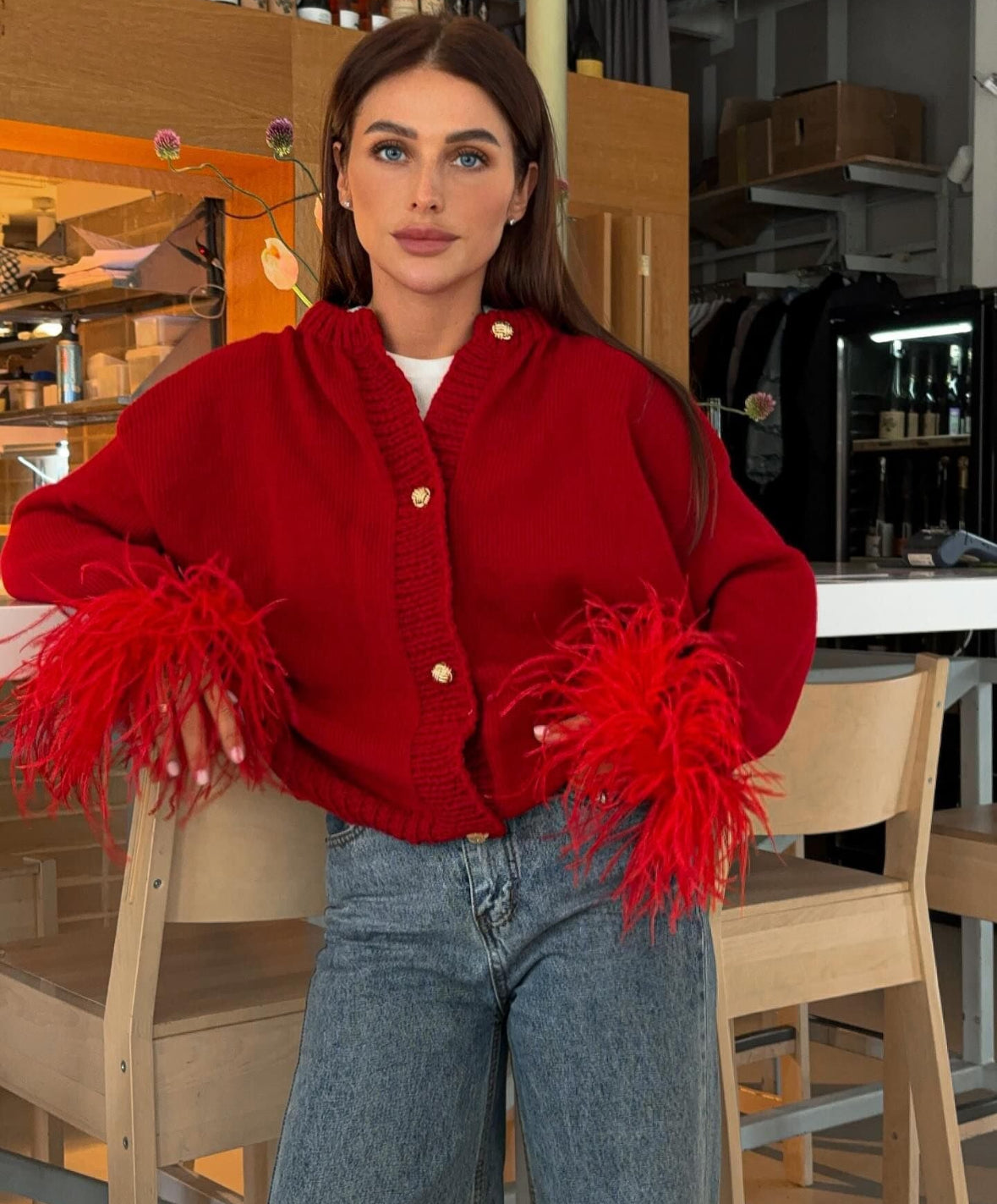 Setze ein Statement mit diesem luxuriösen Cardigan, der Stil und Eleganz perfekt vereint. Die federbesetzten Ärmel verleihen deinem Outfit eine extravagante Note, während die goldenen Knöpfe einen Hauch von Vintage-Glamour hinzufügen. Gefertigt aus hochwertigem Material bietet dieser Cardigan nicht nur einen modischen Look, sondern auch ultimativen Tragekomfort.