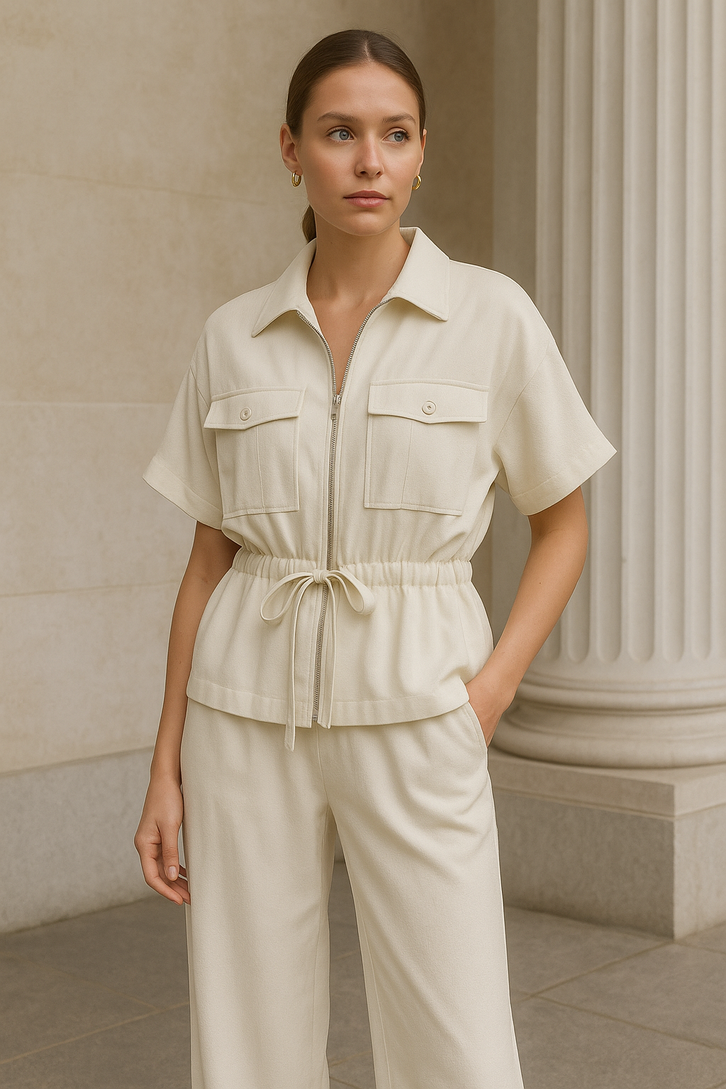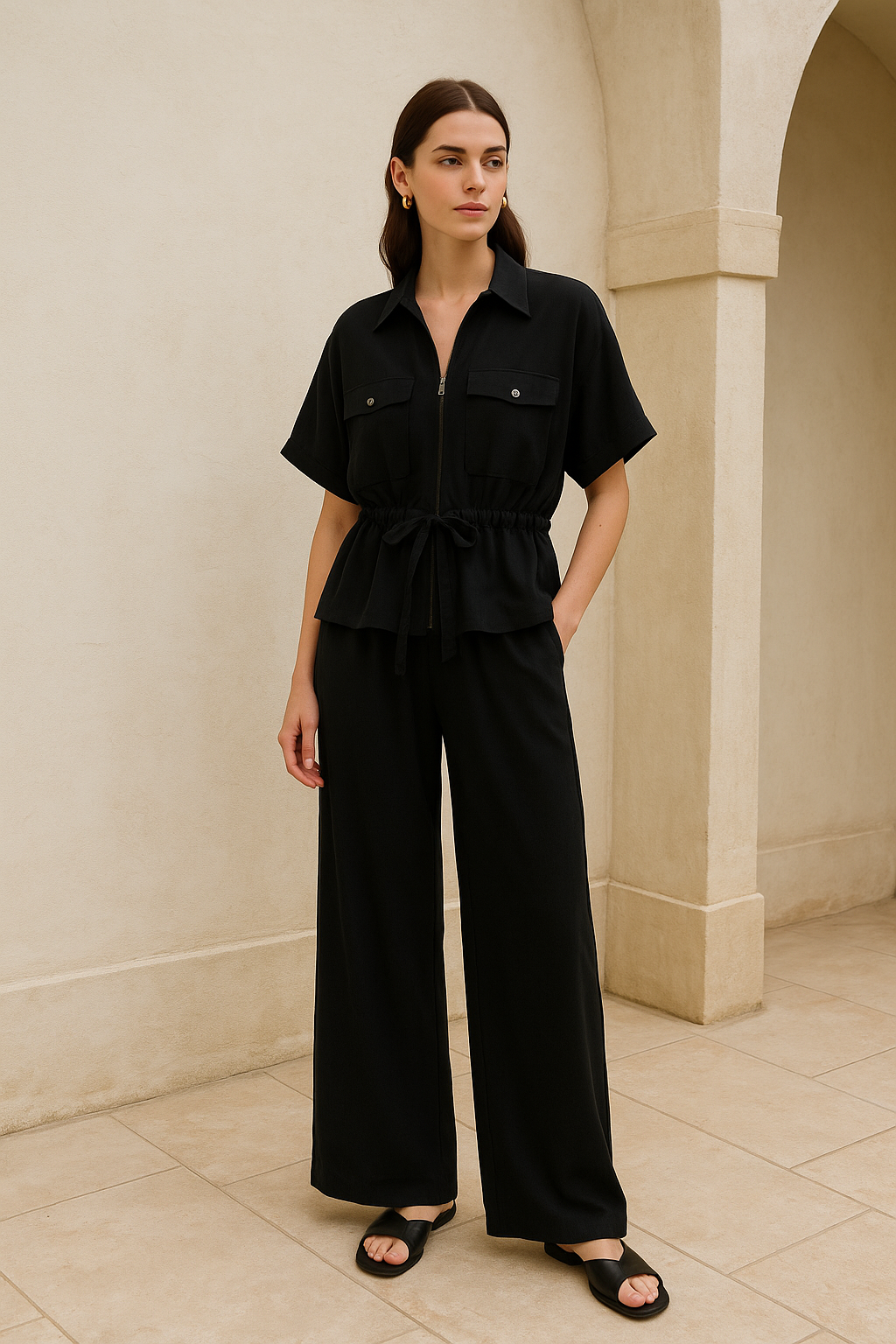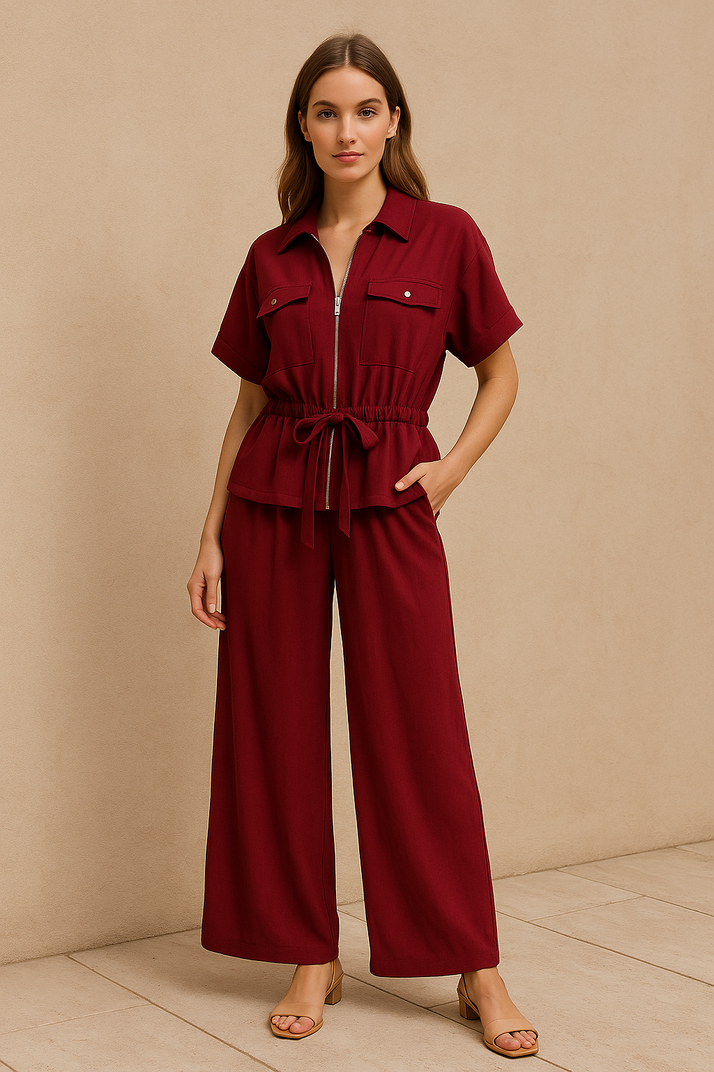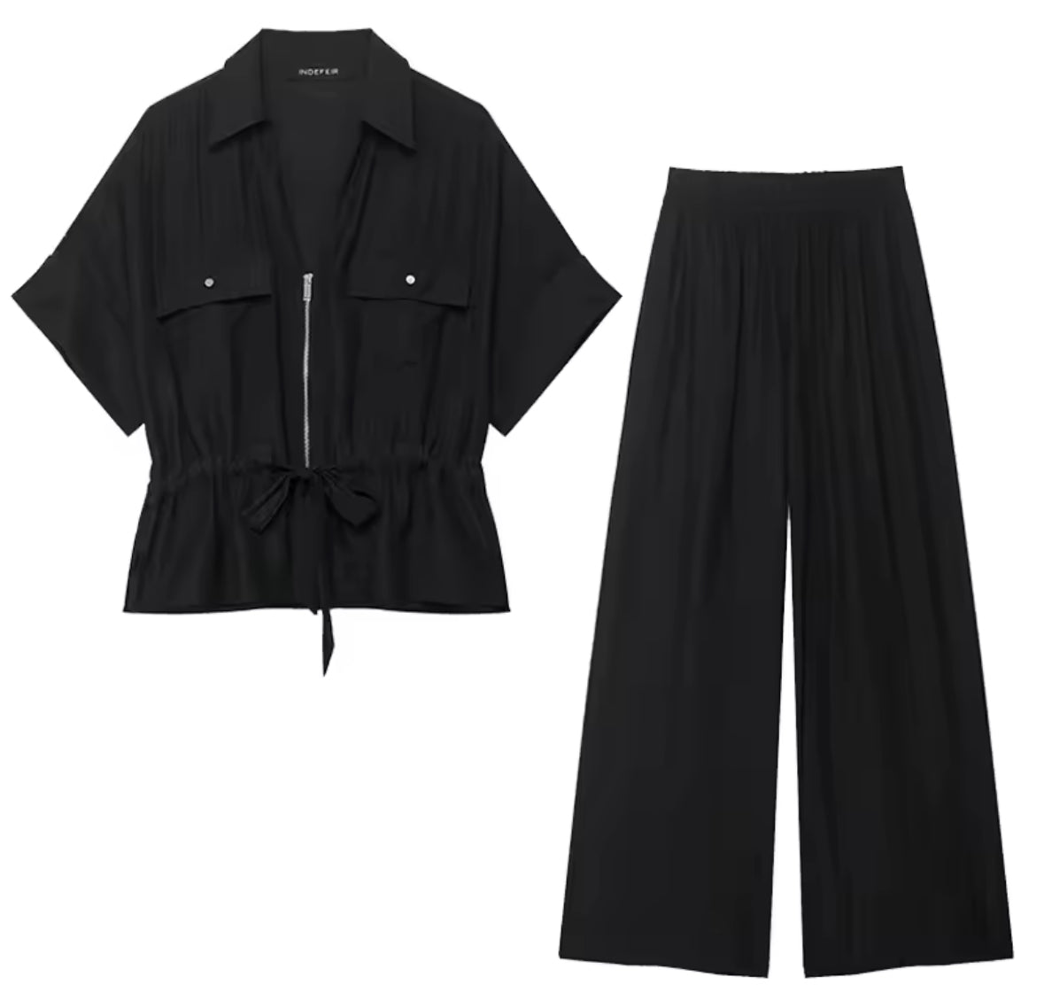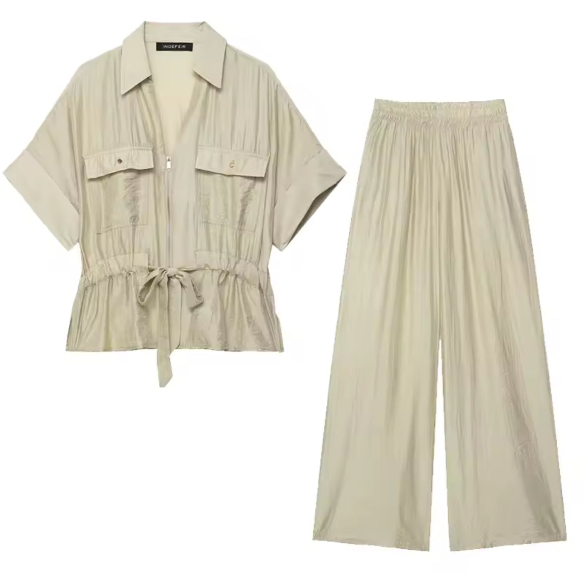Das zweiteilige Set besteht aus einer fließenden Bluse mit Bindegürtel und einer locker geschnittenen, weiten Hose. Die Bluse hat einen leichten Glanz, kurze Ärmel und Brusttaschen, die dem Look einen edlen, lässigen Touch verleihen.